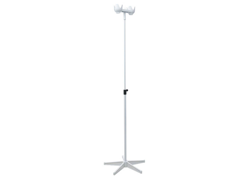 - Стойка выполнена из стальной трубы Ø16*1,5 мм, Ø25*1,5 мм и окрашена порошковой полиэфирной краской. Флаконодержатель выполнен из пластика белого цвета. Лучи основания выполнены из полиамида. Основание сборно-разборное